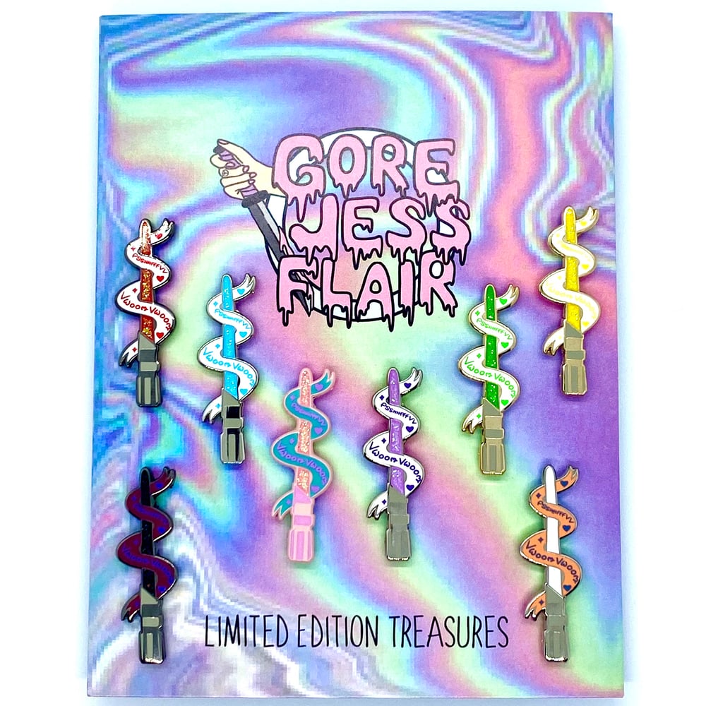 Available as single pins in red, blue, green, yellow, pink and purple or as a full 8 pin set that includes the black and white variants only available through the set